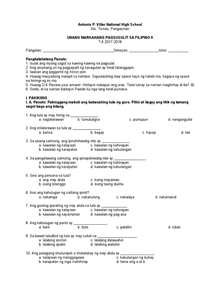 Unang Markahang Pagsusulit Sa Filipino 9 Pdf