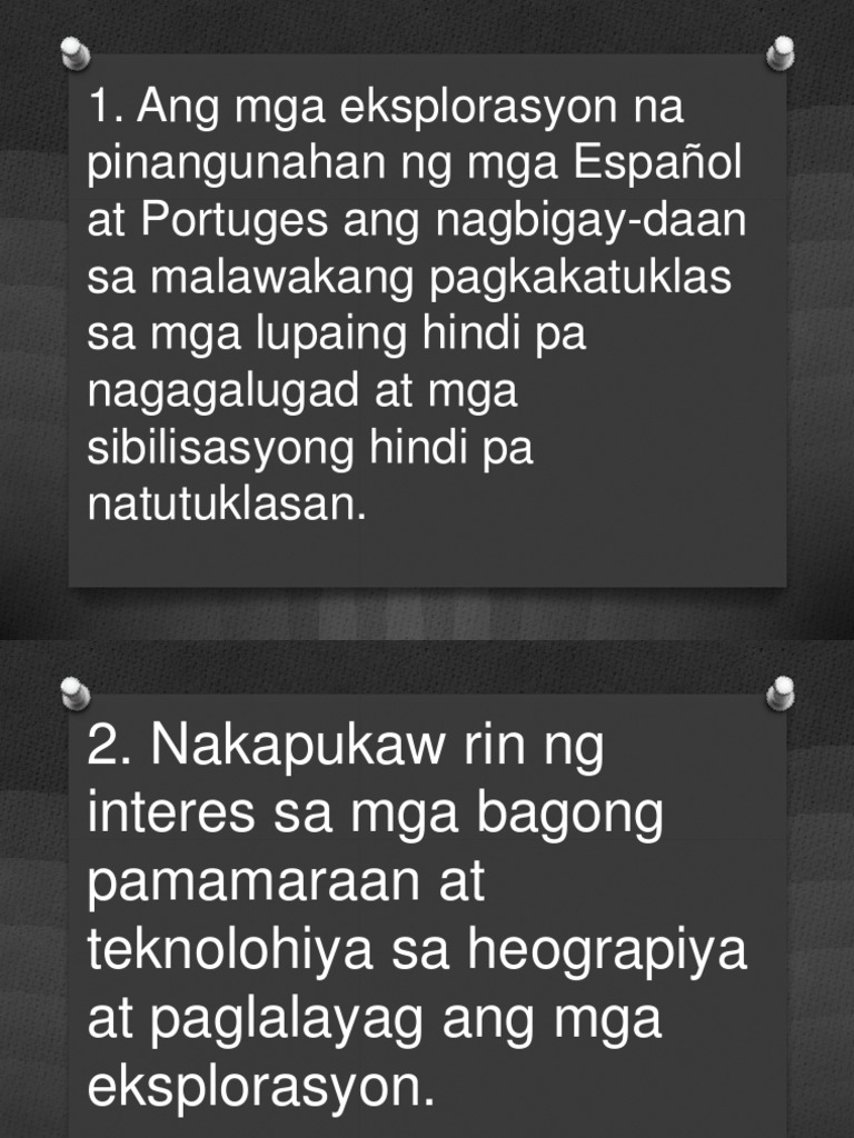 Bli kund på 3 min. Dahilan at epekto ng unang yugto ng kolonisasyonpptx. 1 Ang mga Krusada na naganap mula 1096 hanggang 1273 2 Ang paglalakbay ni Marco Polo 3 Ang Renaissance 4 Ang pagbagsak ng Constantinople 5 Ang Merkantilismo3.