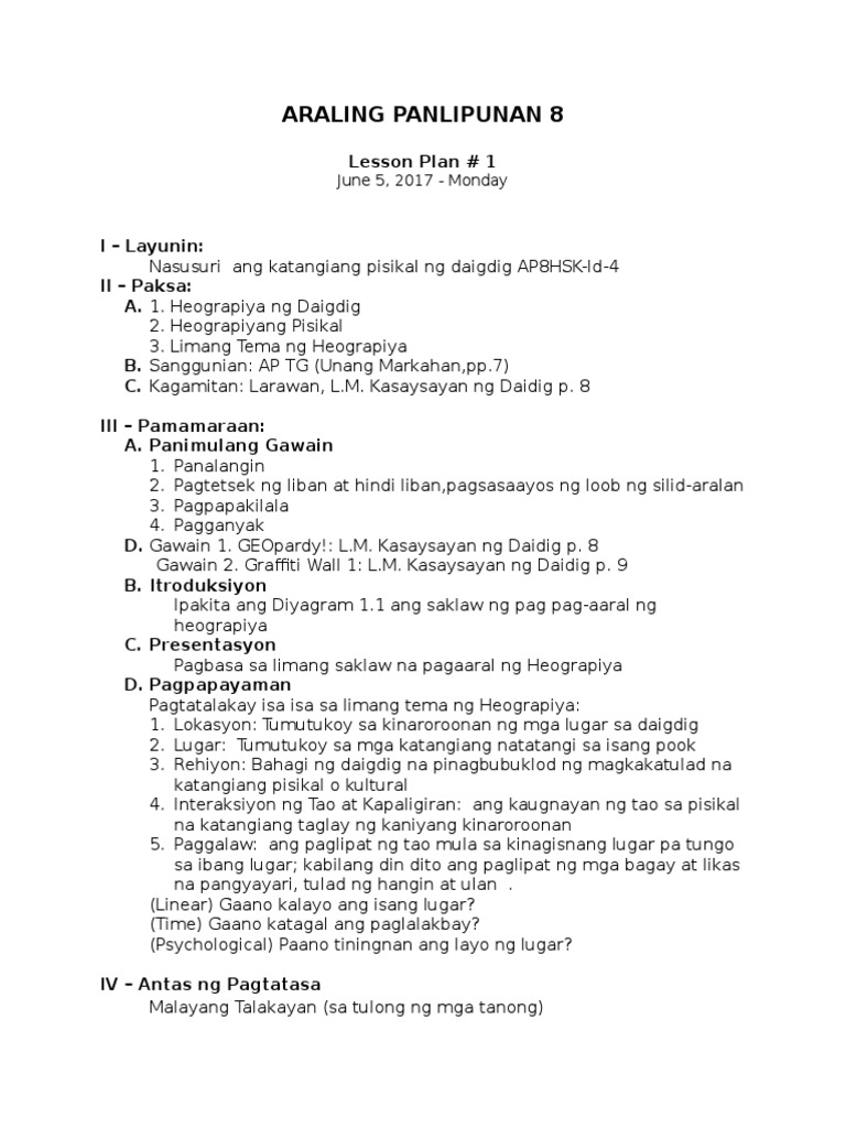 Araling Panlipunan 8 Lesson Plan Day 1 Pdf