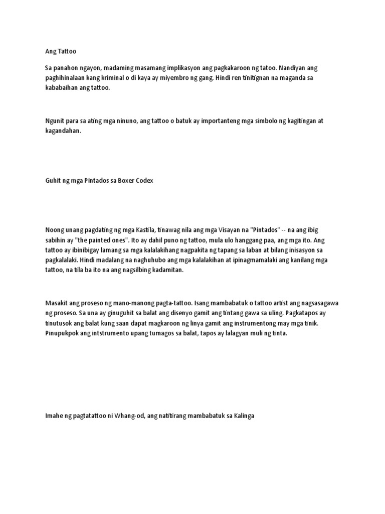 Andoon sina Kaligayahan Kalungkutan Kaalaman at pati na rin si Pagmamahal. Noong unang panahon ano ang simbolo ng tattoo o batuk sa katawan ng isang pilipino. Noon ay apat na pamilya lamang ang nakatira sa nasasakupan nito.