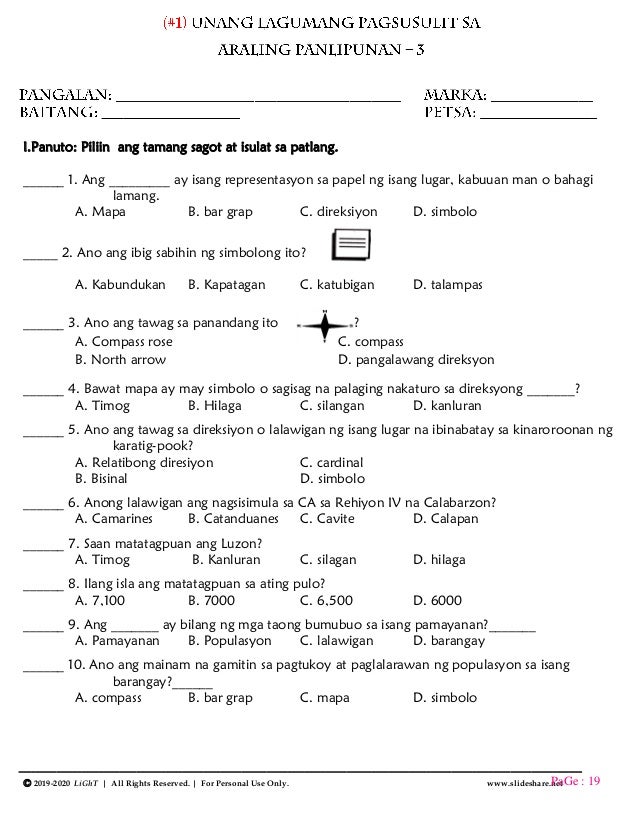 Pagsusulit sa Araling Panlipunan-Mga Sagot. Basahin ang mga akda aytem at sagutin ang mga tanong. Some of the worksheets for this concept are Pagsusulit sa filipino mga sagot Edukasyon sa pagpapakatao baitang 8 unang markahan gabay Edukasyon pantahanan at pangkabuhayan ict Subject araling panlipunan 4 yearlevel grade 4 Subject araling panlipunan 6 yearlevel grade 6.