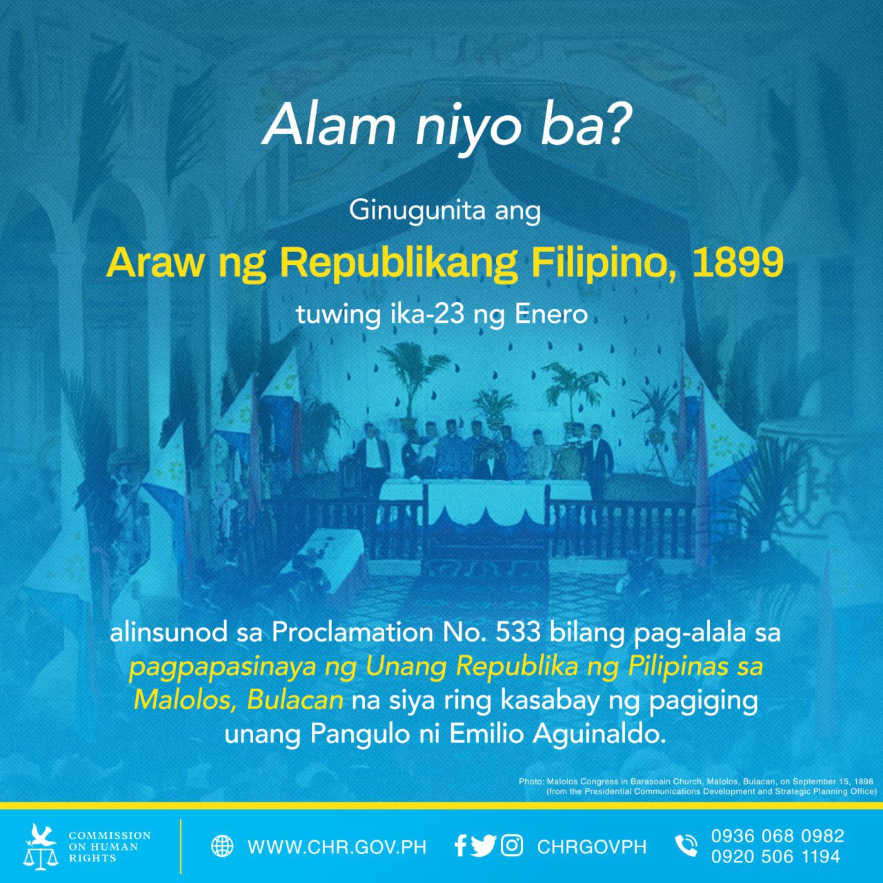 Chr Philippines Pa Twitter 1 2 Noong 23 Enero 1899 Pormal Na Itinatag Ang Unang Republika Ng Pilipinas Na Kumpleto Sa Mga Katangian Ng Isang Estado Ito Rin Ang Petsa Kung Kailan Naihalal Si Emilio Aguinaldo Bilang Pangulo Ng Pilipinas Https T